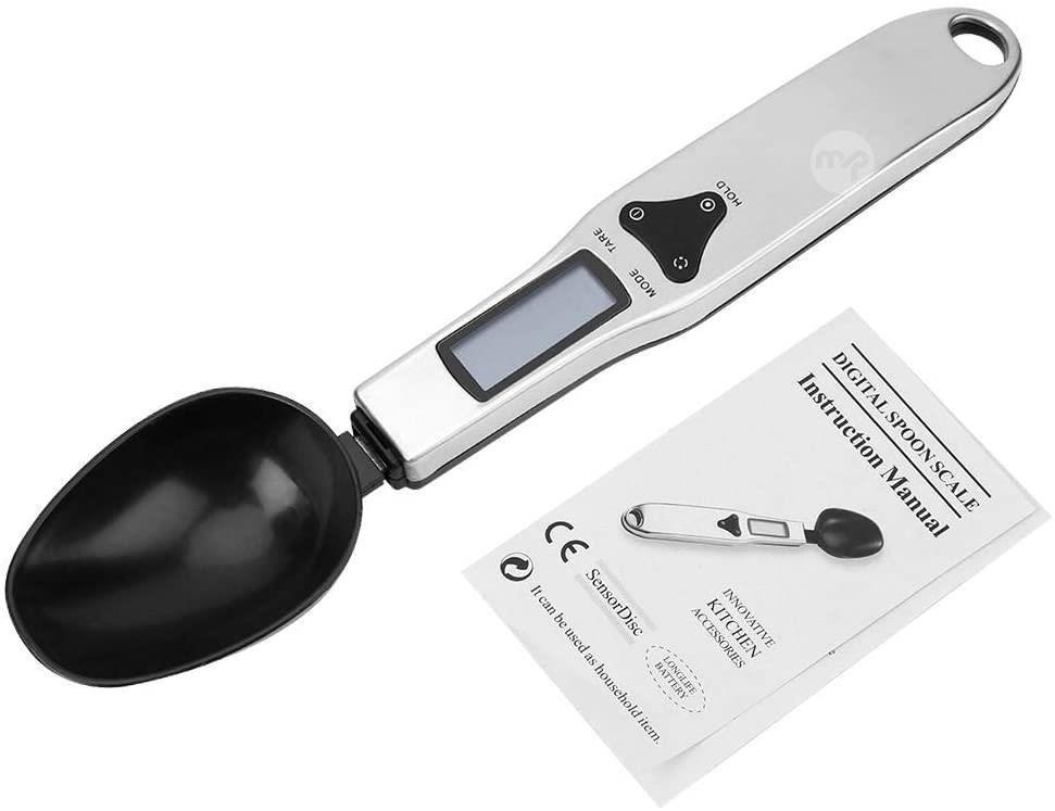 Measuring spoon max.300g Features LCD DISPLAY Digital spoon scale with LCD display, detachable scoop for cleaning, convenient to use 300g capacity with 0.1 gram readability, the balance adjustment function ensures precise measurement 3 keys: tare function, mode function, Hold function Specifications Maximum precision balance: 300 g Scala minimum precision: 0.1 g Material: metal, ABS plastic 4 different weighing modes: g = grams, oz = ounces, ct = carats, gn = grains Operating temperature: 0° C - 40° C (32 ° F - 104° F) Power supply: 2 AAA batteries (included) 5-bit LED display
