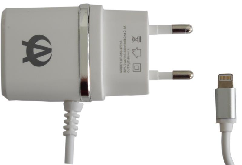 Lightning 1xUSB 1m USB charger power supply Features EAN code: 8067538010491 Vendor code: 01049 Cable length: 1m Cable connector: USB Lightning Power supply equipped with USB port to recharge non-Apple devices Input voltage: DC 100-240V 50 / 60Hz Output voltage: DC 5V Output current: 1A max Compatible with n 10A sockets Not recommended for charging tablets as it has a low output current