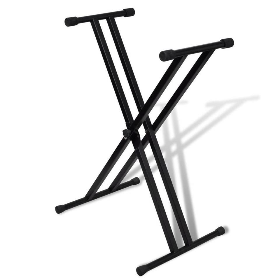 Adjustable double support keyboard stand This X-shaped double keyboard stand station, which is made of sturdy steel, is ideal for musicians, bands, group performances and other music lovers. Made with heavy tube construction, this keyboard station is designed to support your keyboard for many years. With 7 different and adjustable heights, this station could be easily changed to the desired height with substantial stability, thanks to the circular locking mechanism. The anti-slip rubber caps not only protect your floor from scratches but also provide additional support to the base. The foldable design makes it easy to carry and store. Characteristics Max height: 97 cm Min height: 33 cm Maximum opening: 95 cm Minimum opening: 30cm Depth: 32.5cm