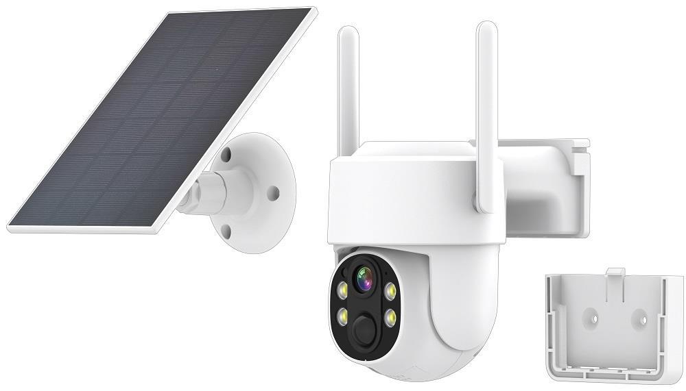 3MP 2k WiFi IP camera with solar panel Characteristics Lens: 4mm F2.0 Pixels: 3 megapixels Resolution: 2k Wide angle: 120° Connectivity: Wifi 2.4/5.0 GHz IEEE802.11b, 802.11g, 802.11n Draft Power: from solar panel or USB cable (included) Input voltage: DC 5V Vertical rotation: 0-90° Horizontal rotation: 0-355° Remote control app Infrared for night vision Motion detection Degree of protection: IP65 (weatherproof) Installation material included
