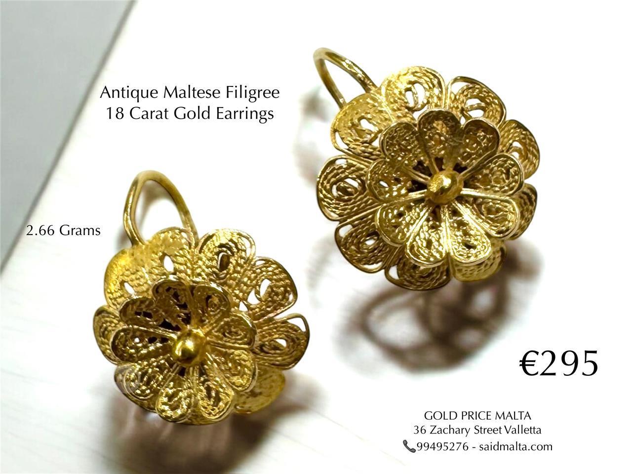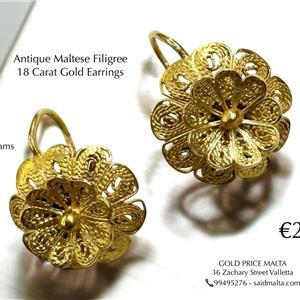 Antique Maltese Filigree 18 Carat Gold Earrings