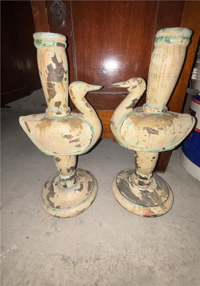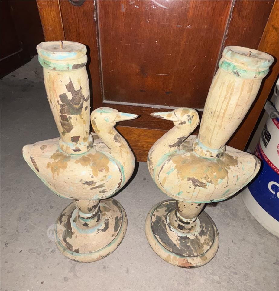 Unique pair of hand-carved wooden bird candle holders, likely decades old. A charming rustic addition to any vintage, boho, or farmhouse-style interior.