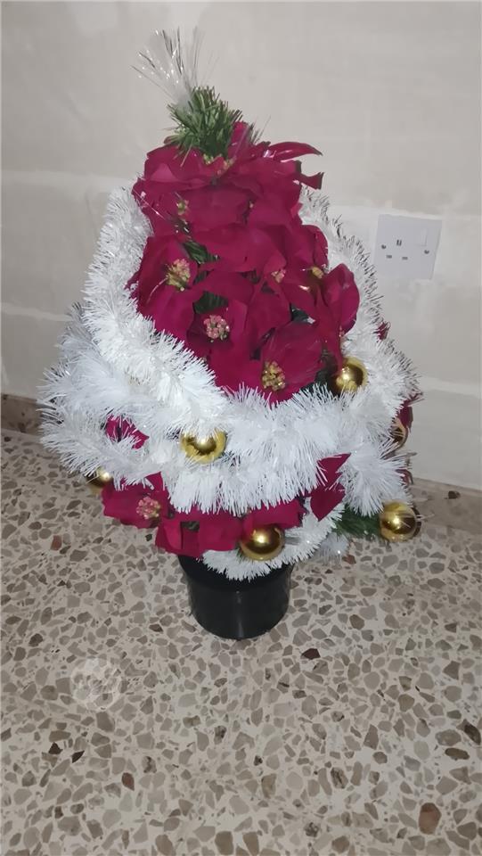 Already decorated with white tinsel, ornaments, and plastic poinsettias.
