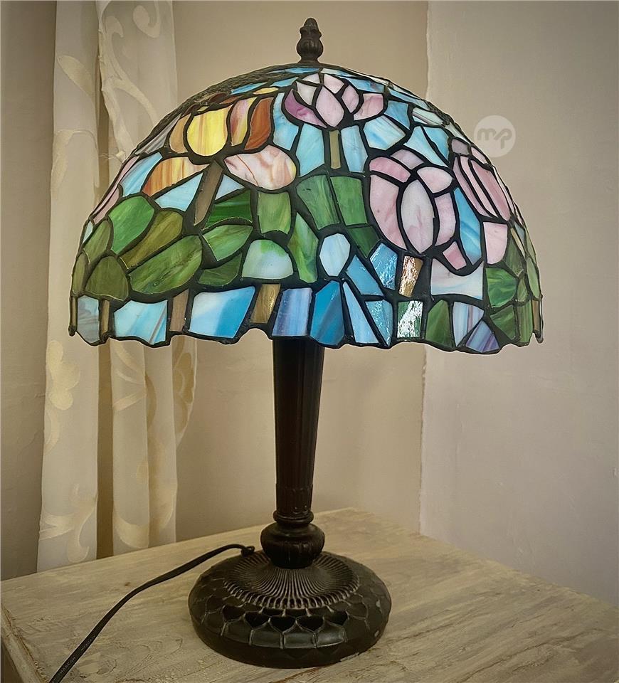 This is a genuine mid-century stained glass lamp, not a modern reproduction. A perfect piece for collectors of vintage lighting, Art Nouveau-inspired décor, or anyone looking for a timeless statement lamp.