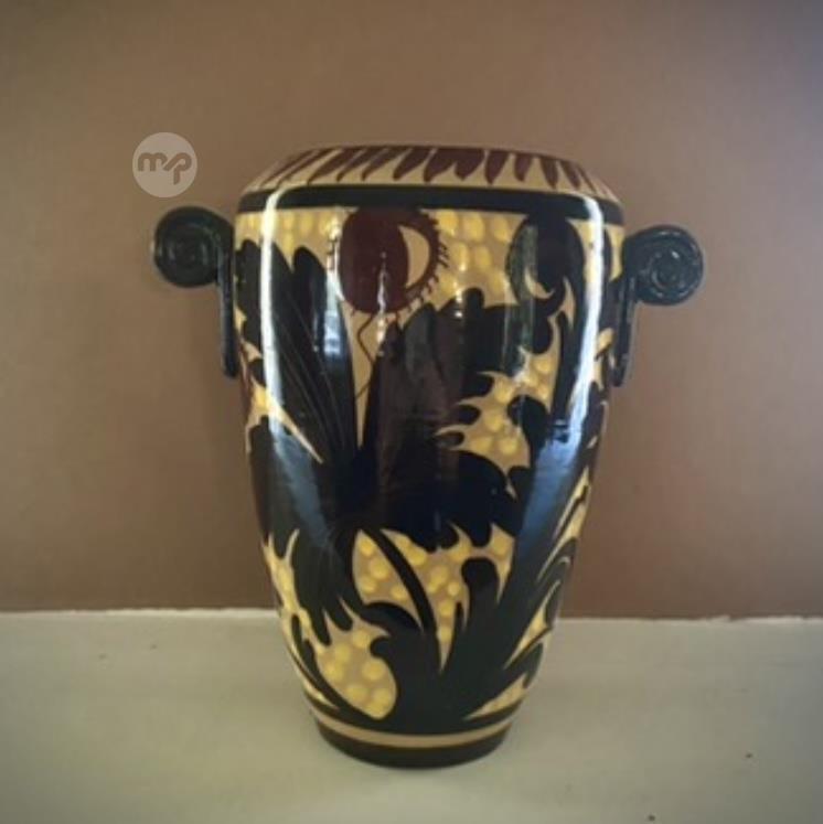 • Design: Classical urn shape with decorative side scroll handles, in rich golden yellow and dark brown/black foliage motifs