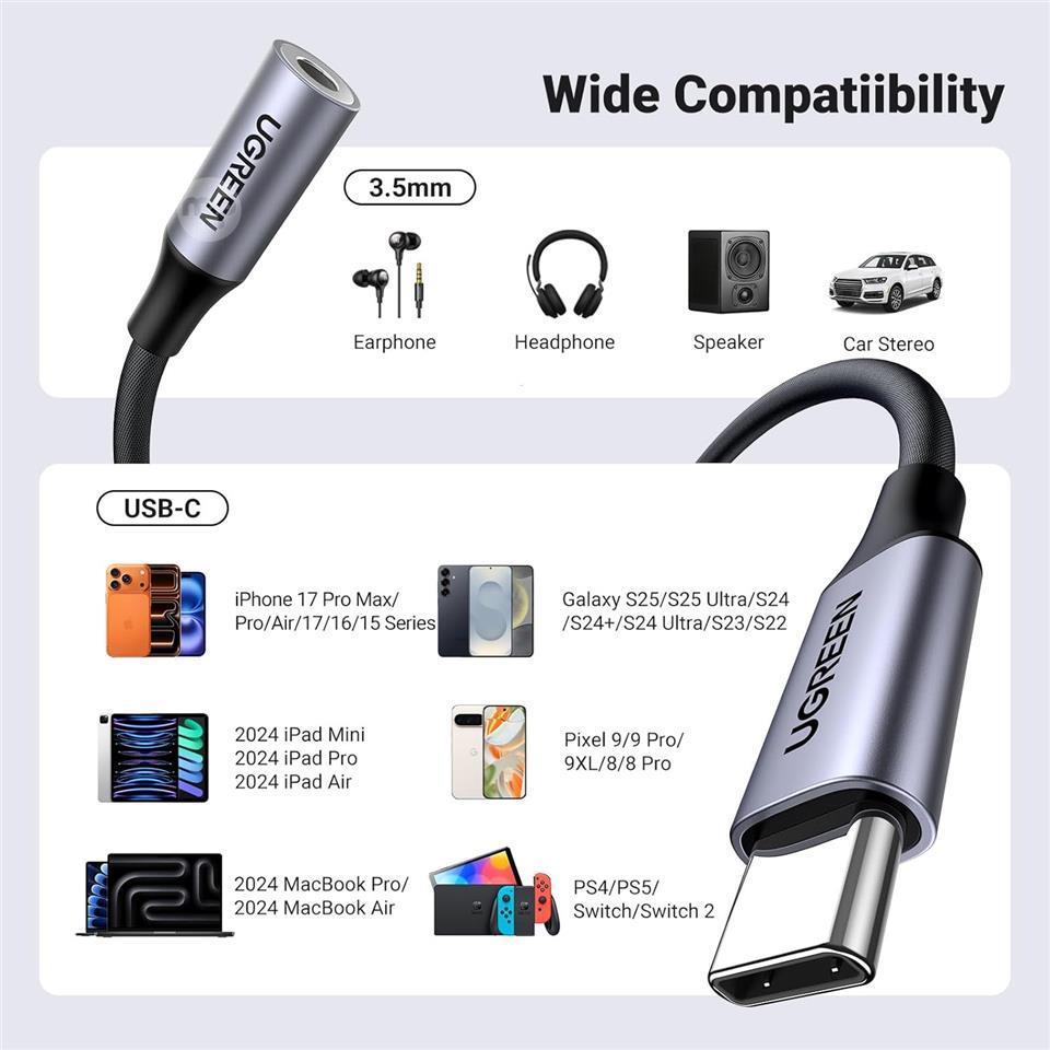 Ugreen AV161 USB-C to 3.5mm Headphone Jack Adapter – DAC Audio Cable (10cm, Black)