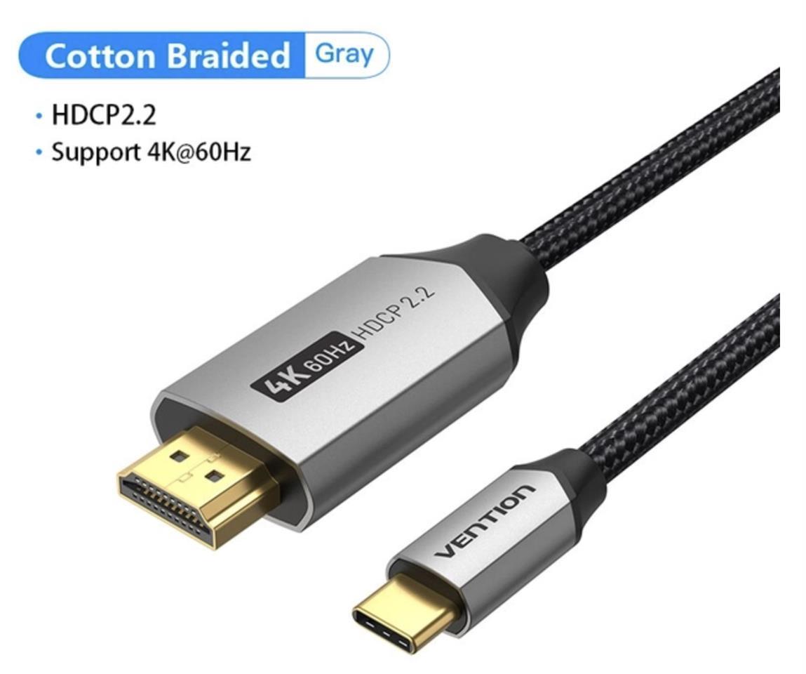High-quality Vention USB-C to HDMI cable designed for connecting laptops, tablets, and smartphones with USB-C ports to monitors, TVs, or projectors with HDMI. Supports Ultra HD 4K@60Hz resolution and HDCP 2.2 for smooth video playback.
