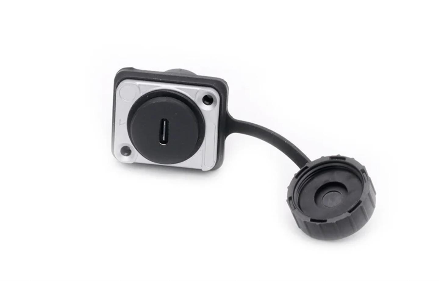 Durable waterproof USB-C to USB-C connector with protective cap.