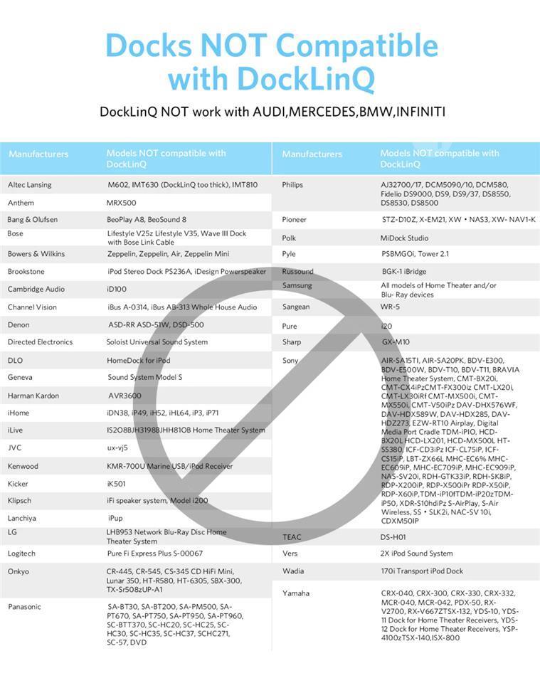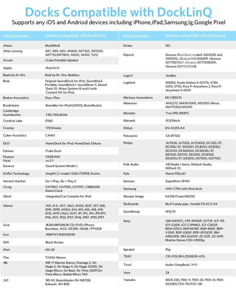 Other 30-pin docks from JBL, Philips, Sony, Yamaha, iHome, Beatbox, Logitech, iHome, Cambridge Soundworks, Harman Kardon, Geneva, Klipsch, and more (see compatibility list).