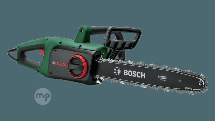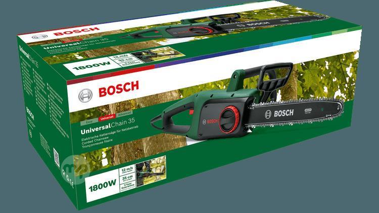 The UniversalChain corded chainsaw weighs just 4.2 kg and features an ergonomic design for maximum convenience. The powerful 1800-watt motor and 12 m/s chain speed ensure fast cutting. The practical Bosch SDS system allows for simple, tool-free chain tensioning and maintenance. The large side oil tank, equipped with a practical corded cap, allows for easy refilling of the automatic chain lubrication system. The robust anti-kickback brake ensures the chain stops completely for greater safety. This handy and easy-to-use chainsaw is ideal for cutting logs, branches, and small to medium-sized trees.