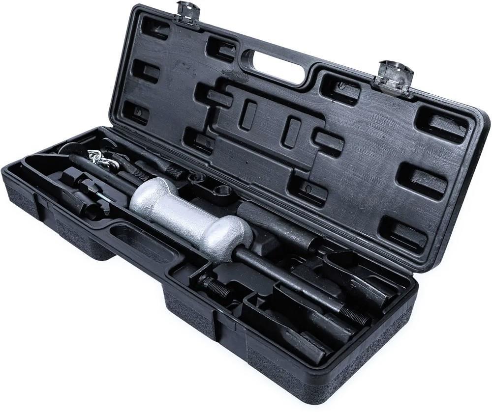 The dent removal set with slide hammer is a comprehensive tool kit specifically designed for professional vehicle repair. Featuring a robust 3 kg universal hammer and a variety of accessories, this set includes everything needed for bodywork dent removal. The 11 pieces consist of nine different hooks and accessories that allow for flexible application. The slide hammer thread with dimensions of 7/8" x 14 UNF ensures easy handling and compatibility with common tools. Made from high-quality chrome vanadium steel, this set guarantees durability and reliability in use. With a total weight of 8.09 kg, it is both stable and handy, making it an ideal choice for workshops and hobby mechanics.