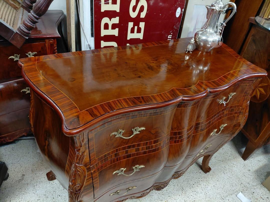 A FRENCH STYLE SERPENTINE FRONT AND SIDES CHEST OF 3 LARGE DRAWERS String inlay Brass handles and in perfect condition Measures 120x50 x 90 cm from floor Price of 580 euros Including delivery t