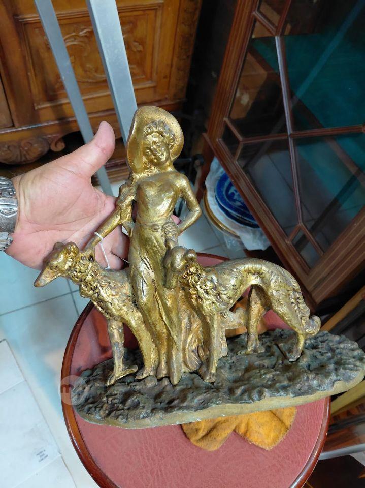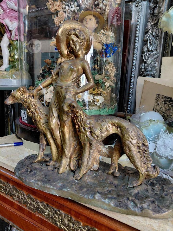 A 15 Kg Solid Bronze Statue Showing an Art Deco style , Woman with two borzoi