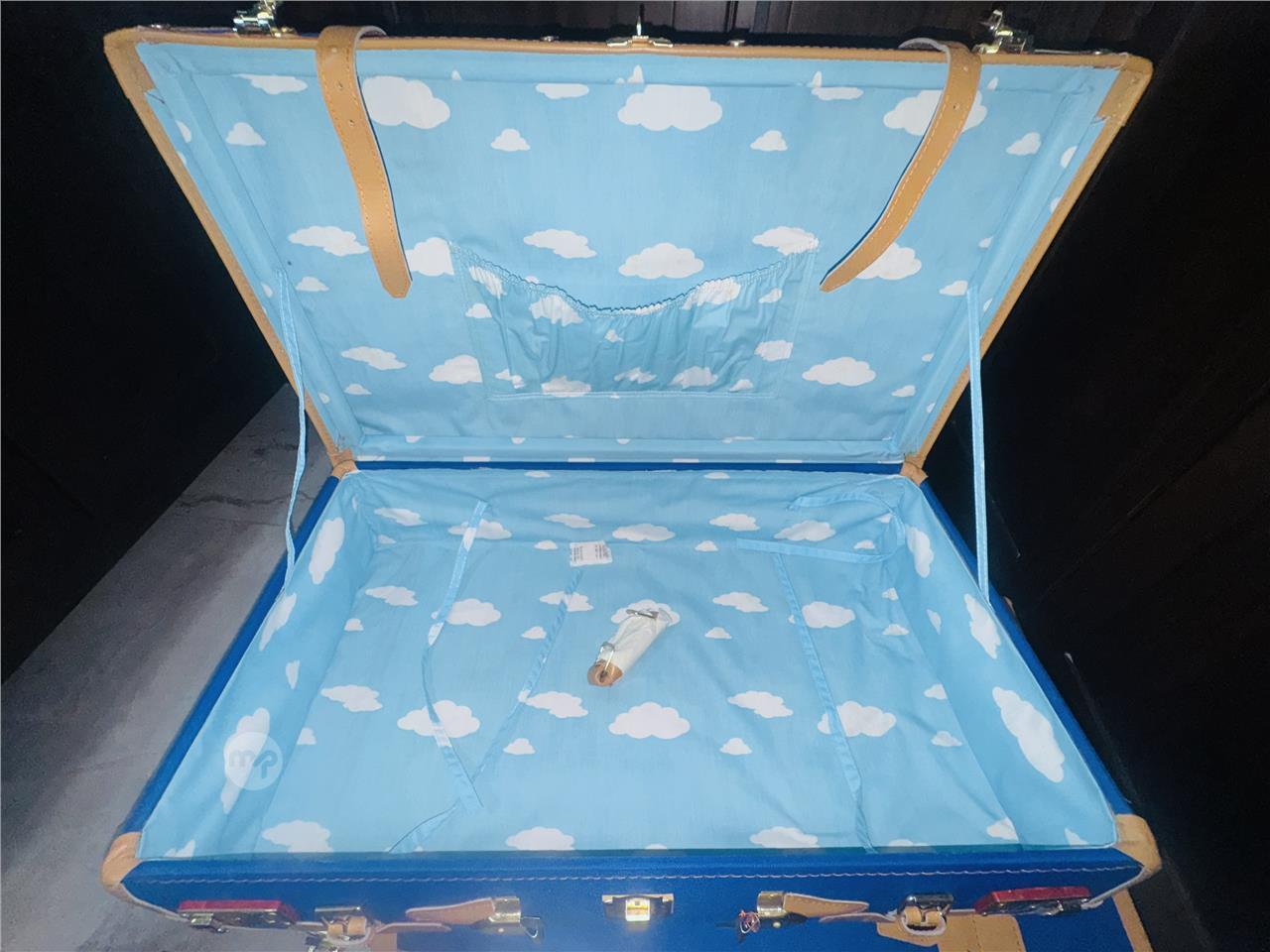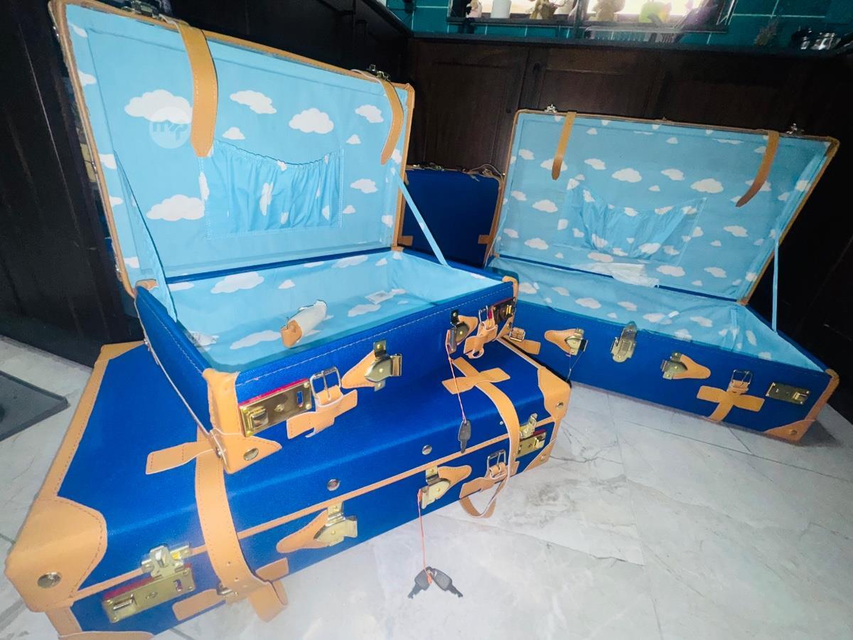 Beautiful vintage-inspired 4-piece luggage set in striking royal blue with tan leather-style straps and gold hardware. The interiors feature a light blue lining with a charming white cloud print.