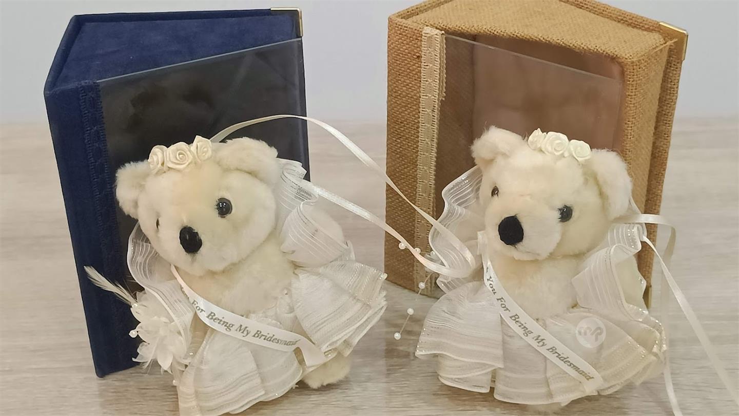 2 Bridesmaid Teddy Bear Souvenirs with glass door box