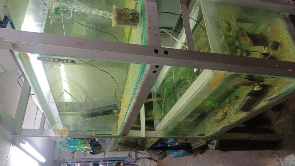 Two aquriums on an aluminium stand ,one on top of the other.aquariums measurments are