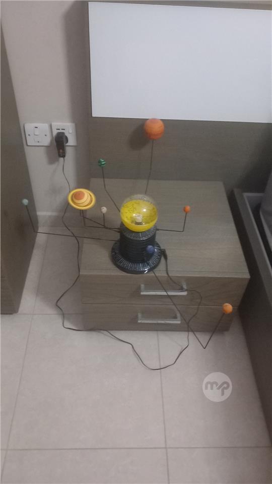 Good condition, ideal for astronomy lovers. It spins automatically and lights up (bulb needs to be replaced). It works with dc.