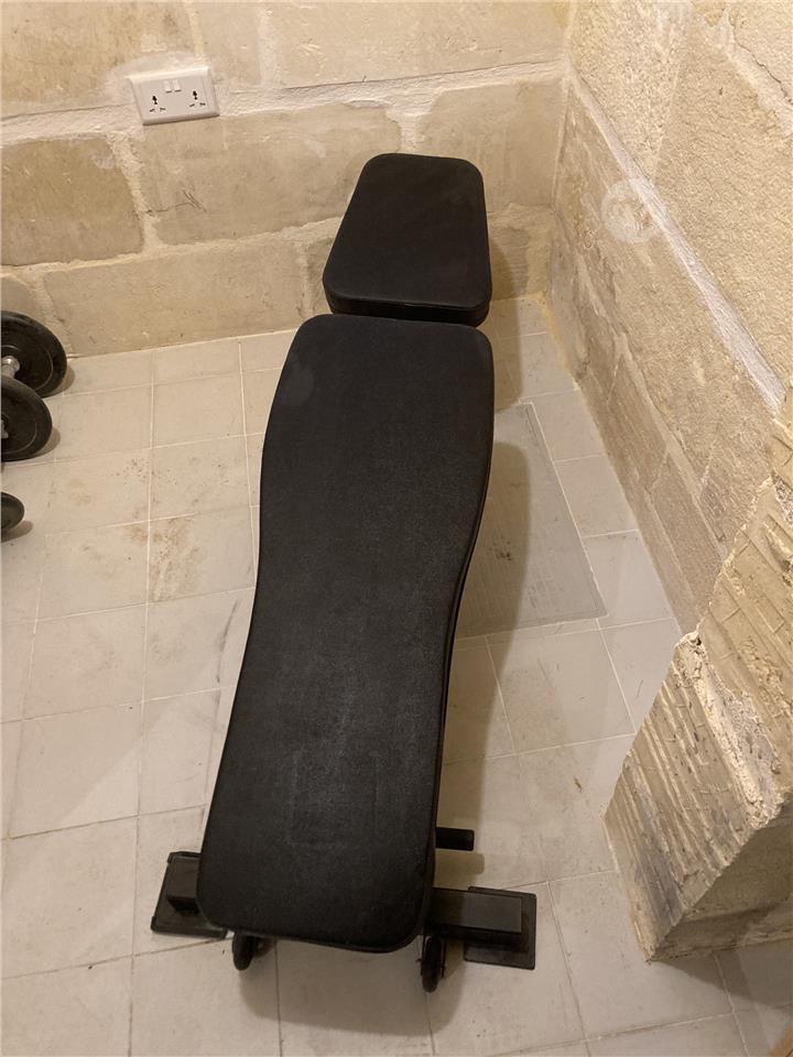 Full home gym set including adjustable bench, EZ curl bar, two dumbbell bars, several weight plates (around 50 kg total), and extra accessories. All in good condition, used occasionally.