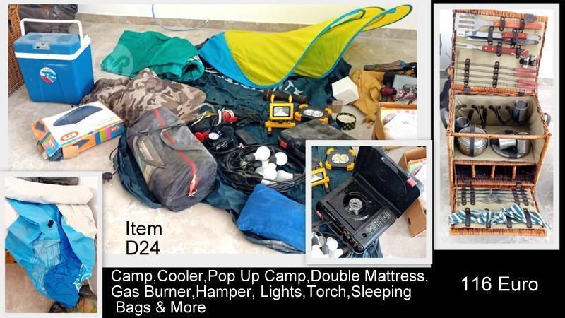 ( D24 ) CAMPING POOL BURNER SLEEPING BAGS CAMP HAMPER LIGHTS & MUCH MORE