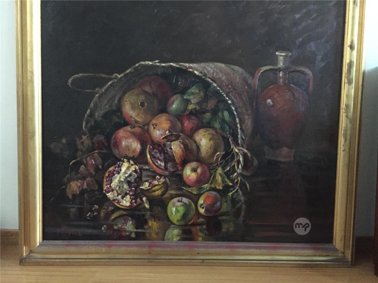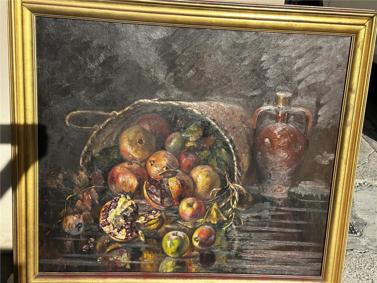 This is an antique painting from the local artist Victor Fleri Soler . The subject is fruit scattered from a basket