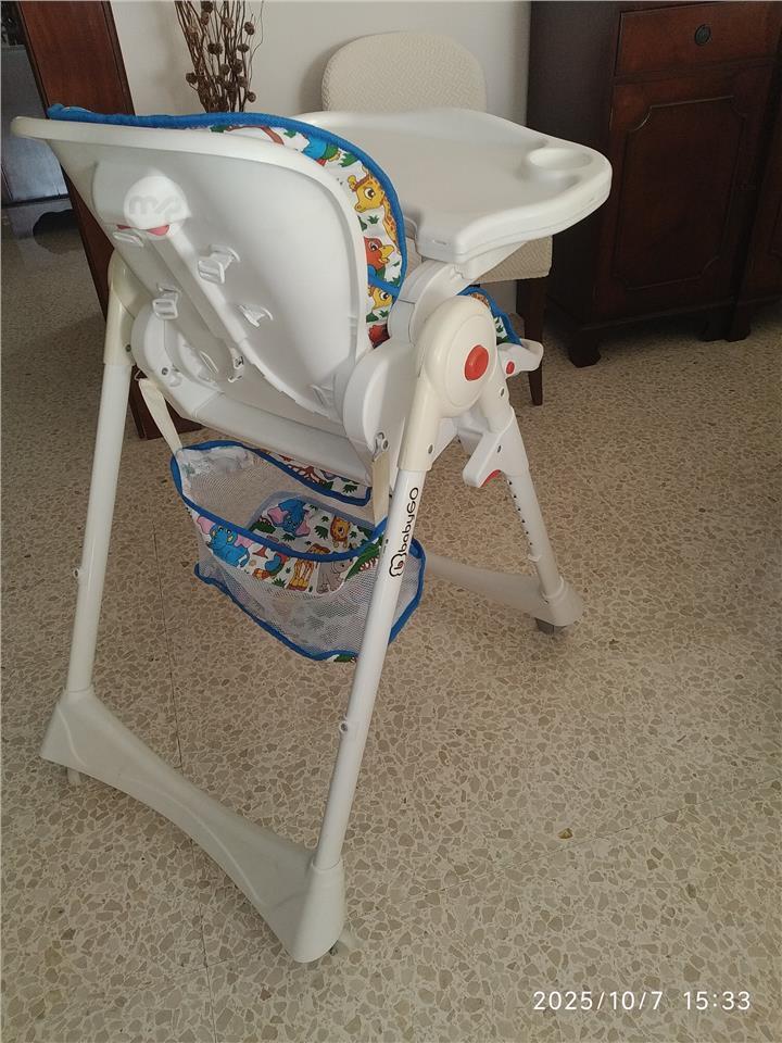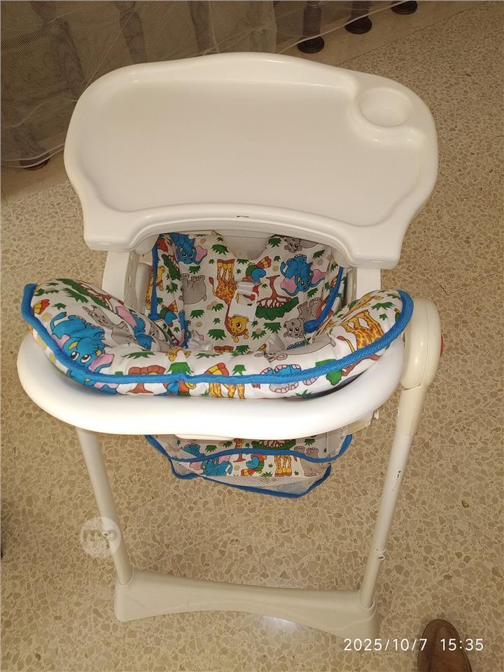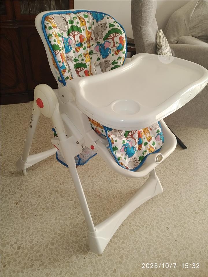 Comfortable and easily adjustable baby's highchair. The colourful seat (with harness) may be tilted backwards, height lowered and table has 3 settings. Easy to move around with 4 wheels. Very good condition.