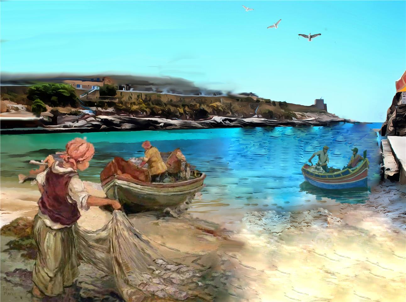 FISHING DAY IN XLENDI GOZO ------ ORIGINAL HAND PAINTING OIL ON CANVAS 70X50