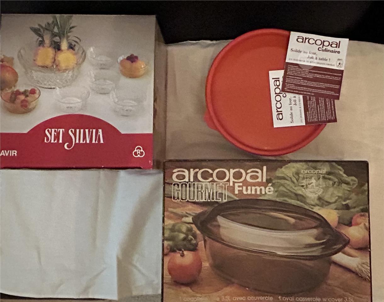 Brand new still boxed dessert serving dishes and bowl, cooking dishing and matching cooking round / dessert container all