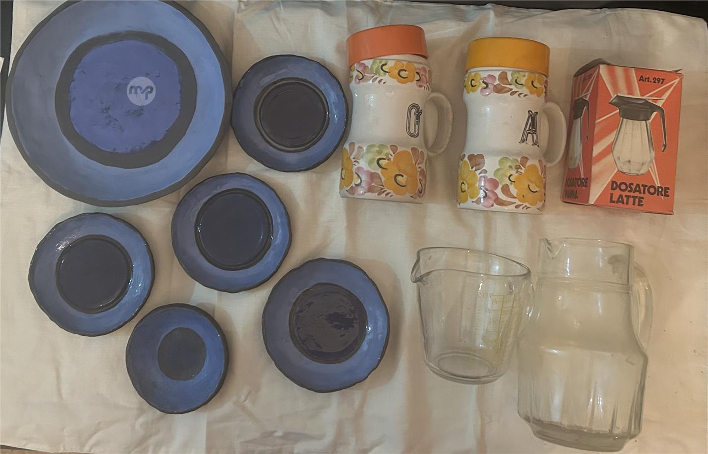 Set of plates with measuring jug large jug 2 retro storage containers and pourer