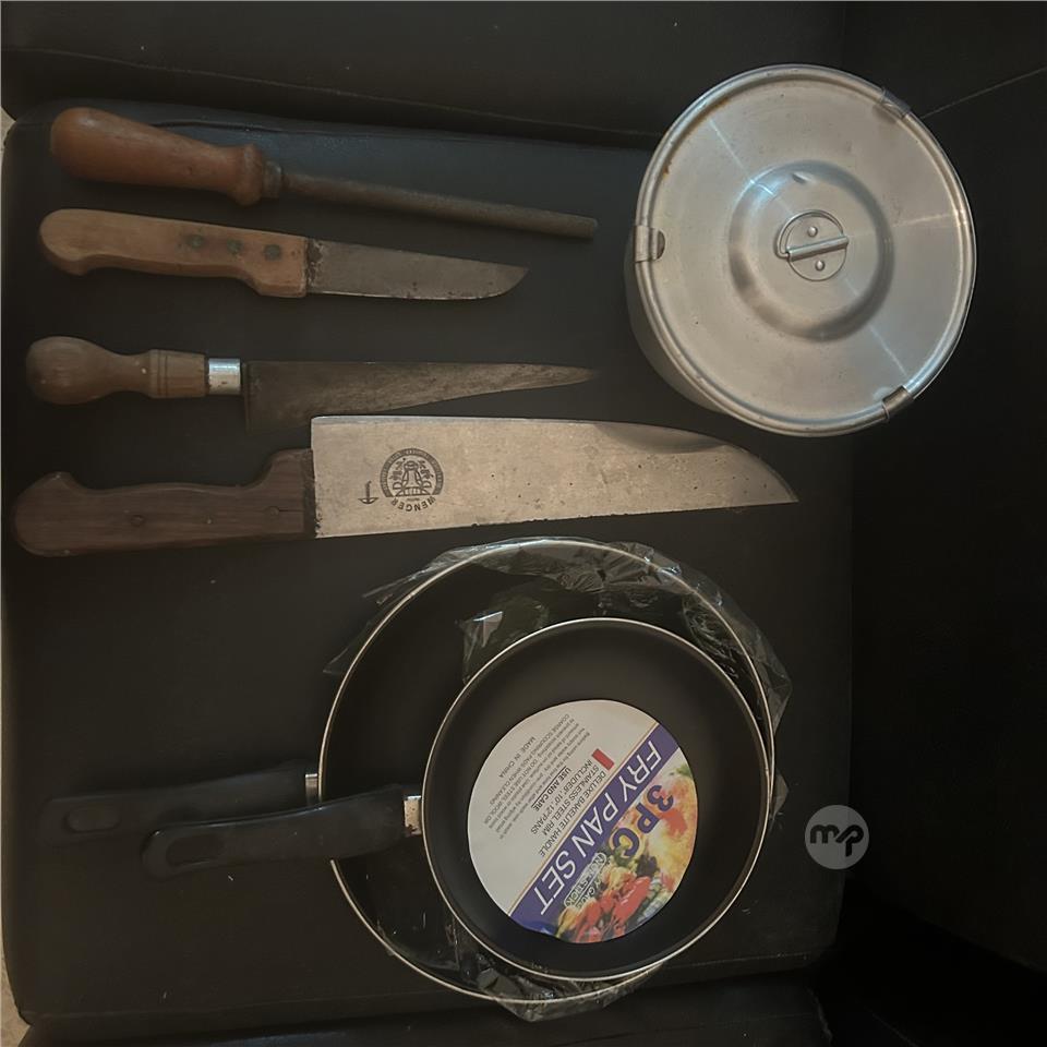 Matching set of knives 2 non stick frying pans and stainless steel food container can be used for cooking 10 the lot