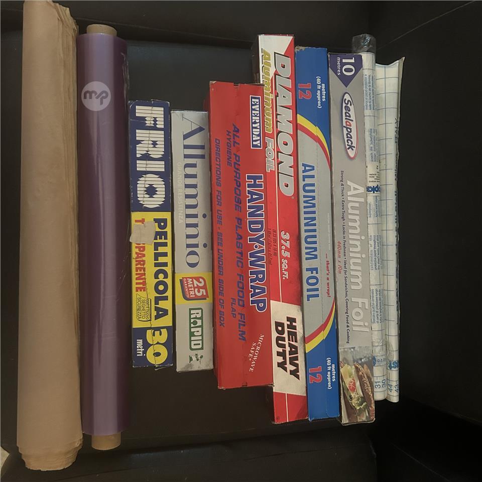 A selection of items for cooking of aluminum foil, parchment paper, plastic wrap heavy duty some new still boxed 10 the lot Call