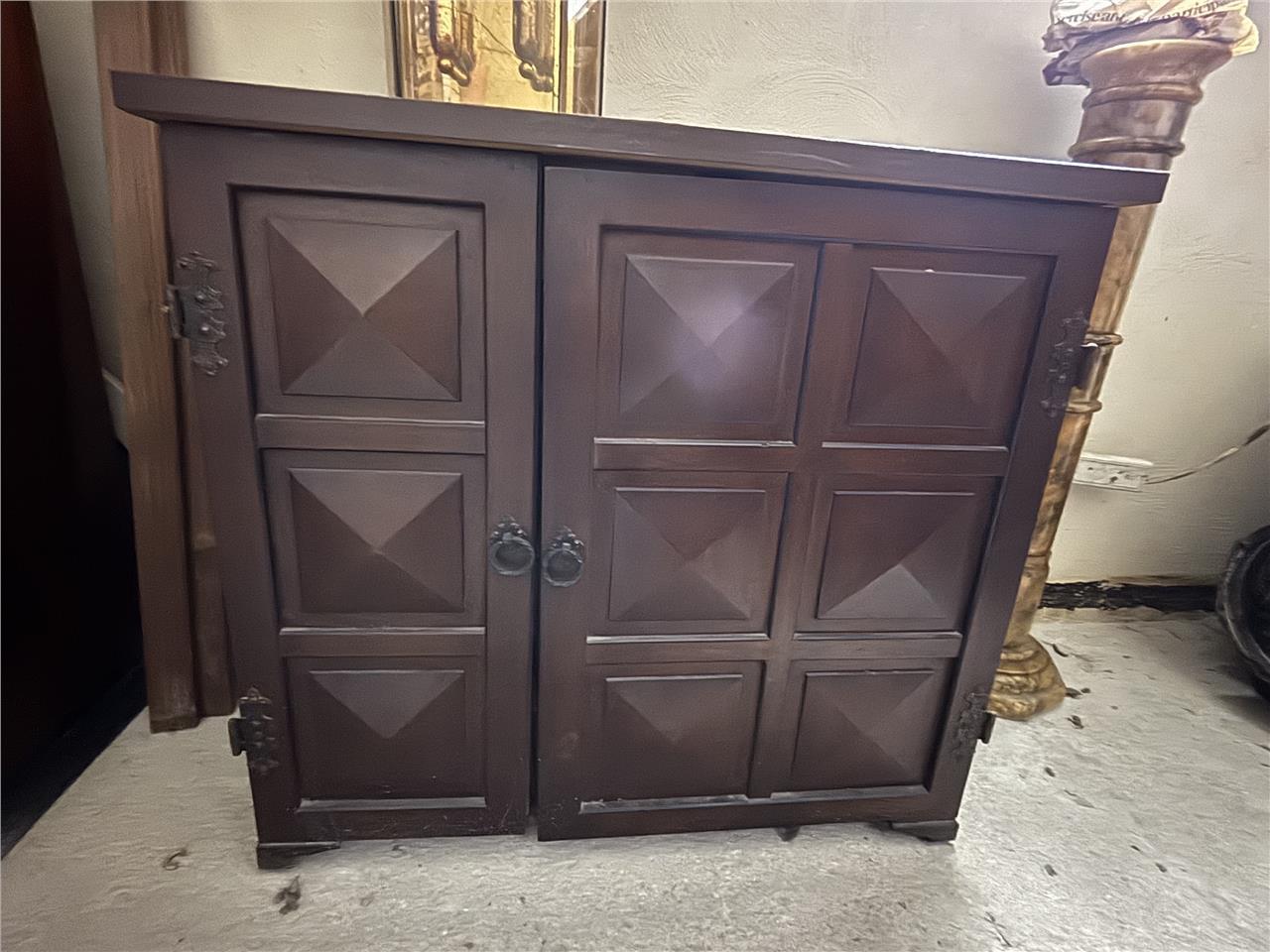 Beautiful vintage wooden sewing machine cabinet with fold-out top and double-door storage.