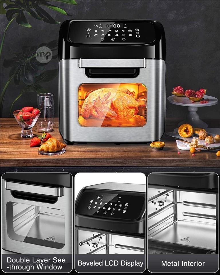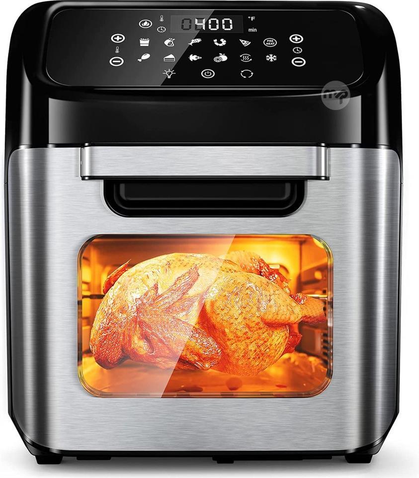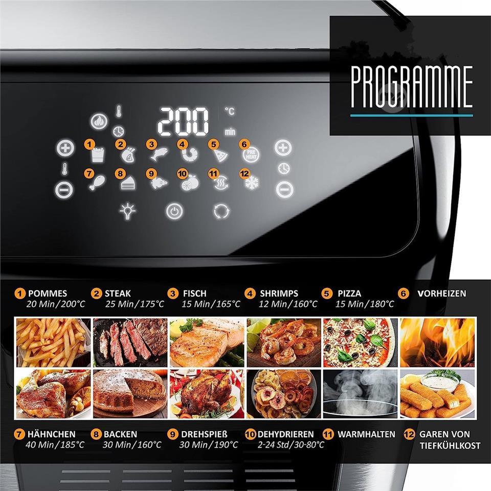 Programs: 12 pre-set functions (Fries, Steak, Fish, Shrimp, Pizza, Drumstick, Cake, Rotisserie, Dehydrate, Preheat, Frozen, Reheat)