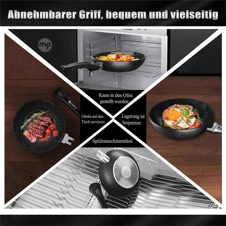 Set Includes: Fry pan: 24 x 6.5 cm, Fry pan: 28 x 6.5 cm, Casserole: 28 x 14 cm with Glass Lid, Casserole: 24 x 14 cm with Glass Lid, Casserole: 20 x 10 cm with Glass Lid, Casserole: 16 x 8 cm with Glass Lid, 4x Silicone Handles