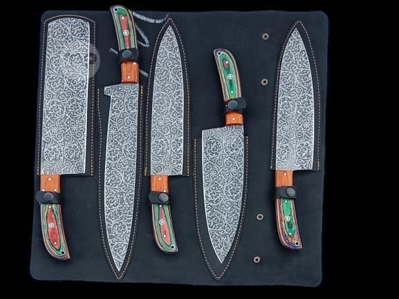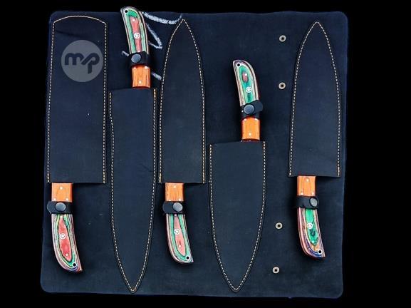 6 pcs, handmade, damascus chef knives set, multicolored wooden sheet handle, leather case SCZ-985