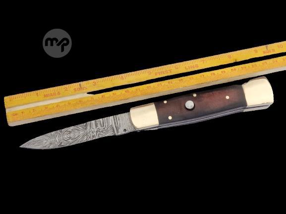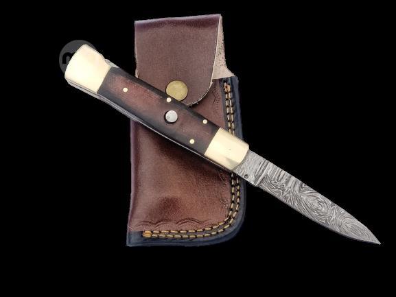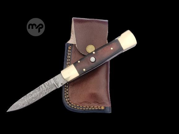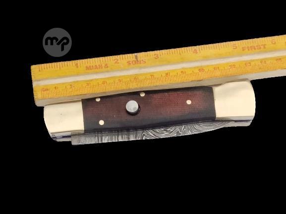 MODEL NO=SCZ-937(B) BLADE LENGTH=13.50 CM HANDLE LENGTH=13.70 CM BLADE MATERIAL DAMASCUS STEEL HANDLE MATERIAL BROWN MECARTA SHEET • CLIP MATERIAL BRASS HARDNESS 63-65 HRC