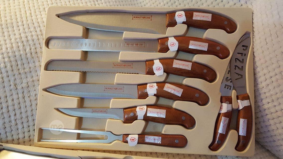 Content: Chopper, Chef Knife, Ham Knife, Bread knife, Slicing Knife, Boning Knife, Cheese knife, Pizza knife, Fork, Sharpener, 6 Forks, 2 kitchen scissors, 6 steak knives