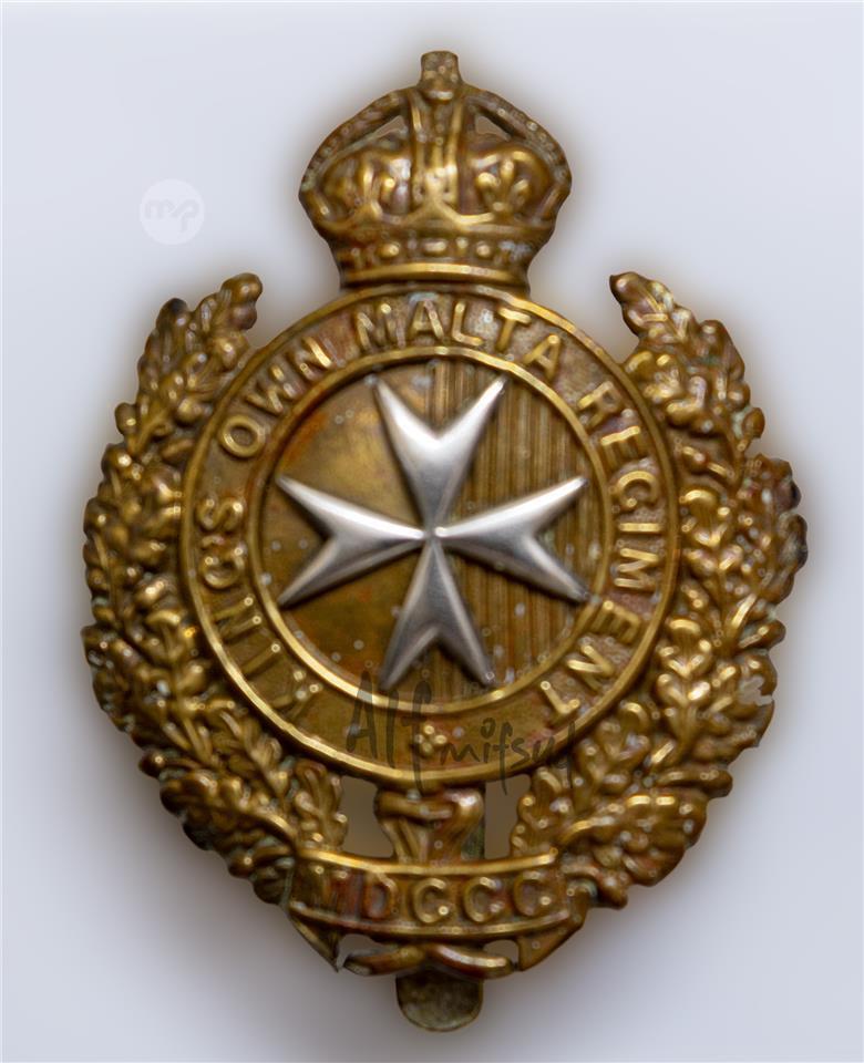 The MALTA REGIMENT. At centre is an eight-pointed Maltese Cross in white metal mounted on a field denoting the Maltese Colours, all within a wreath of oak leaves. At bottom is a scroll with ‘MDCCC’ (1800), commemorating the Maltese Light Infantry during the blockade of the French garrison of occupation, and as the first Maltese regiment raised by the British. The whole topped by a Tudor or King’s Crown, denoting the British monarch of the time. In great condition with a unusual back pin.