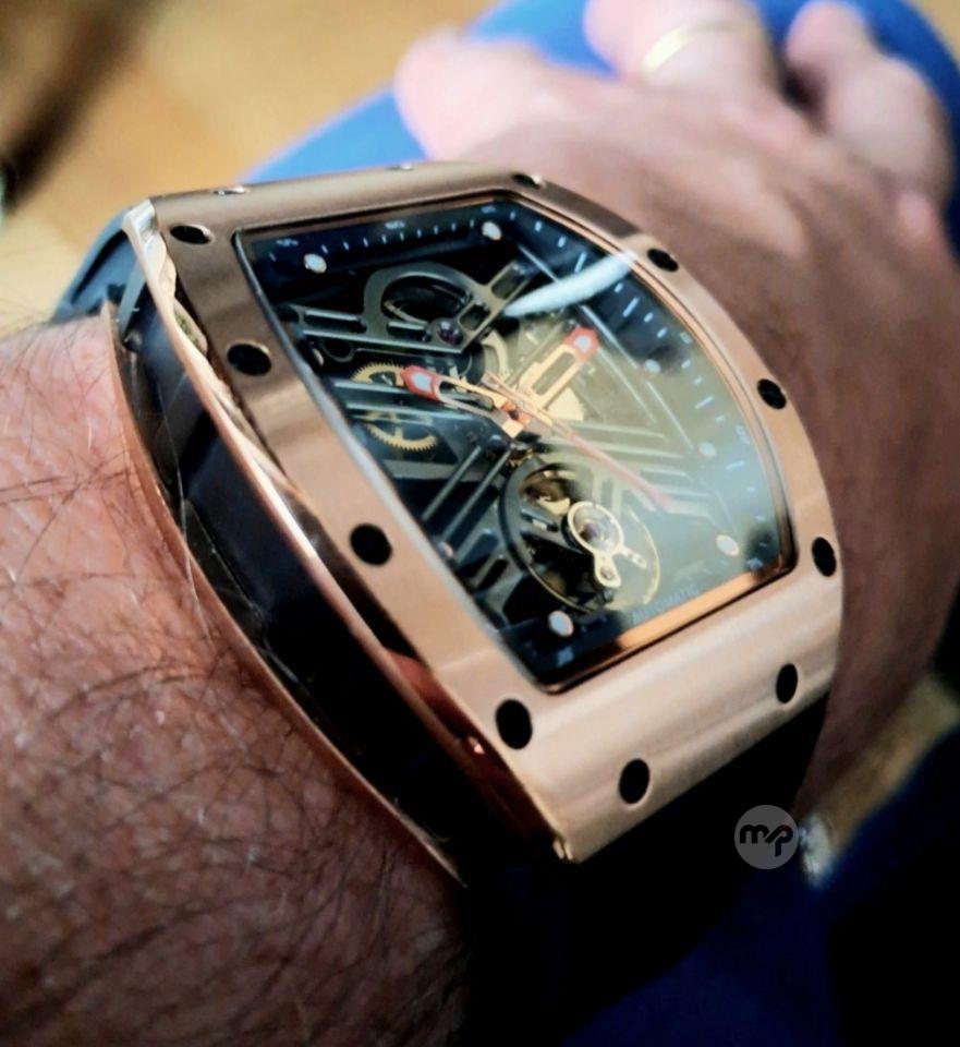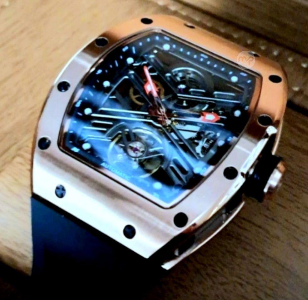 Very beautiful and rare Vantora skeleton watch with blk silicon strap/signed blk buckle.....automatic.....rose gold/blk......42mm x 50mm.......limited edition of 30 pieces.....box included !