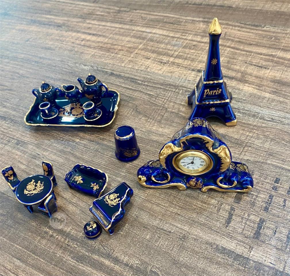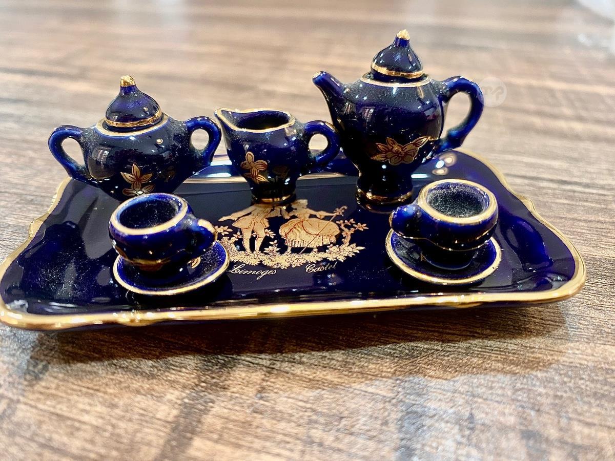 Vintage Limoges cobalt blue & gold porcelain collection, made in France. These miniatures (often marked Limoges Castel or Limoges France) were very popular souvenirs and collectible sets in the 1960s–1990s. They were hand-decorated with real 22k gold detailing.
