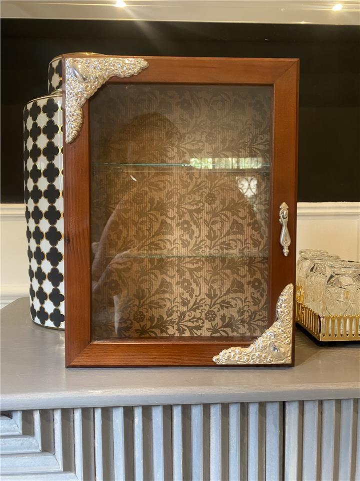 The cabinet features a glass front door, two internal glass shelves, and a silk-style damask backing, creating a refined setting for displaying silver miniatures, collectibles, or heirloom keepsakes.