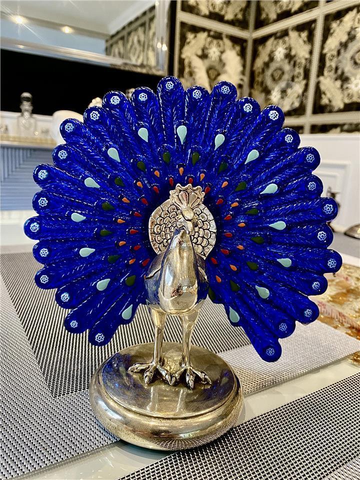 Magnificent Italian silver-laminated peacock figurine, featuring a detailed silver body and a spectacular hand-enameled tail in rich cobalt blue and emerald green.