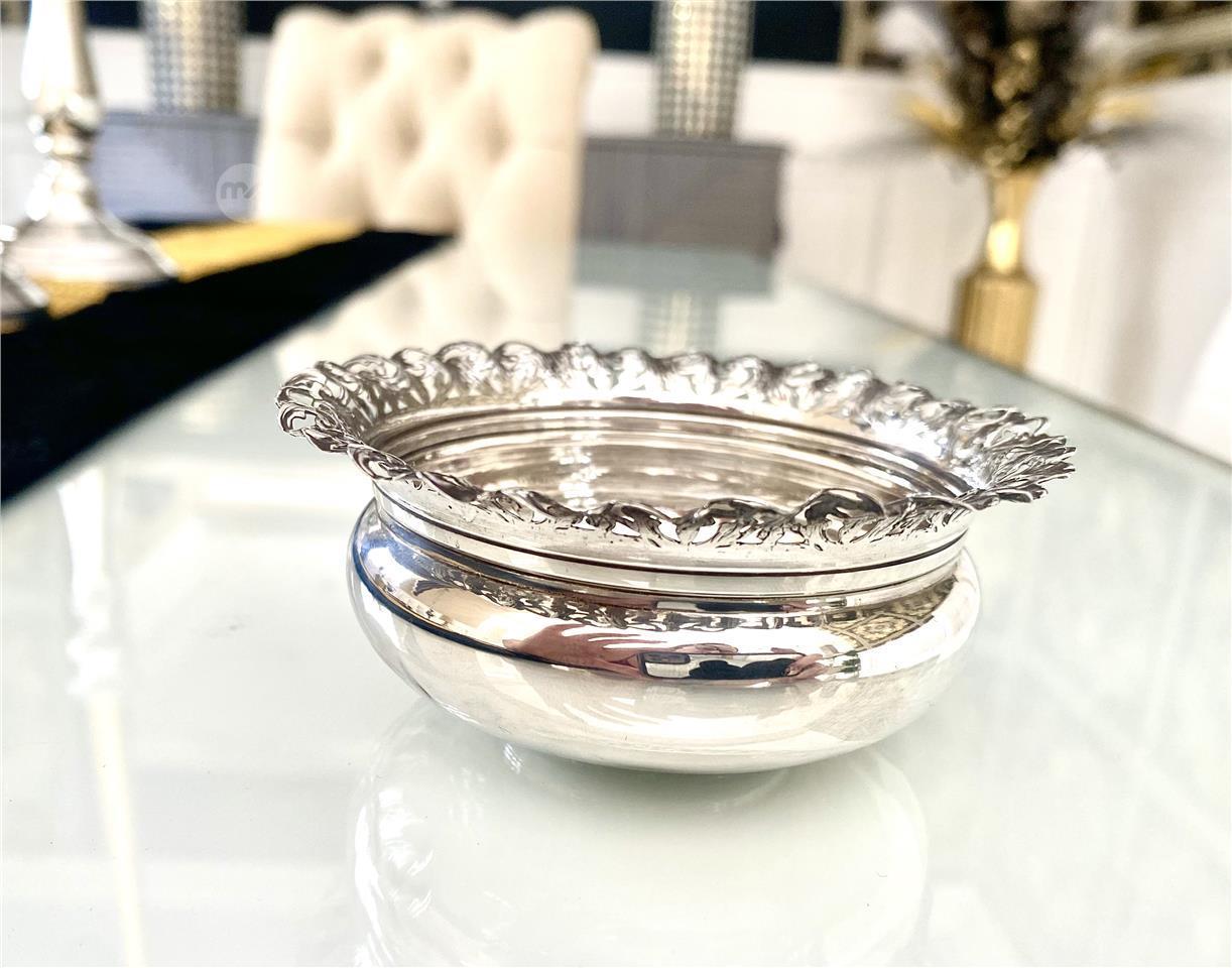 Elegant small sterling silver bowl with a detailed fluted rim and smooth polished body. Crafted in solid 925 silver, it weighs 34 grams and features fine workmanship, ideal as a decorative accent or collectible silver piece. Excellent condition with high shine and no dents.