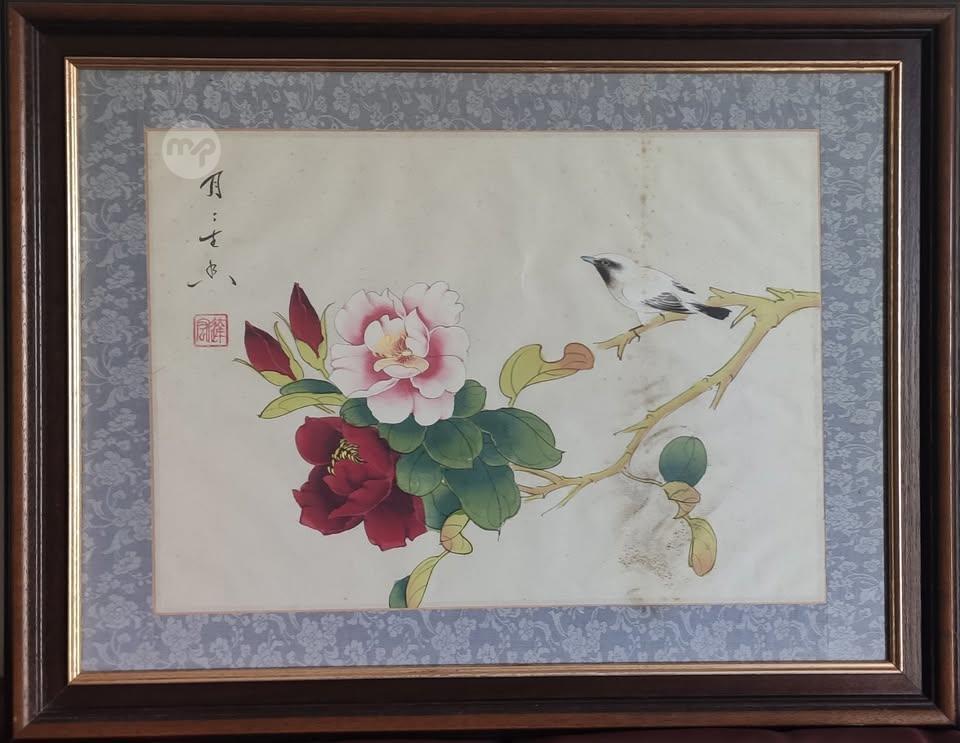 Vintage Set of Four Watercolor Paintings Framed - Symbols of Grace, Stillness, and Spirit. These paintings are a traditional form of Chinese art form where ink and coloured pigment are applied on Silk Fabric.