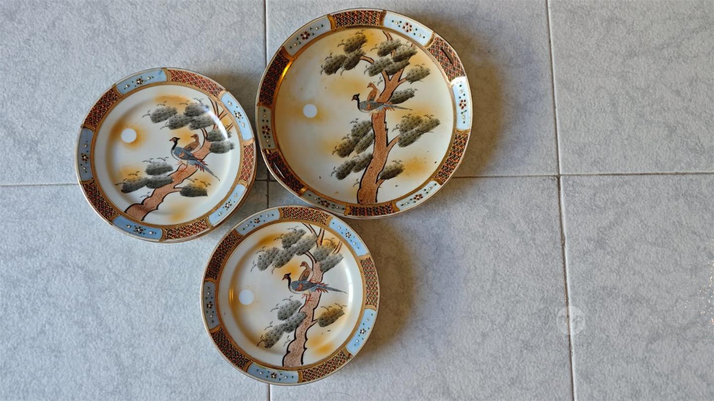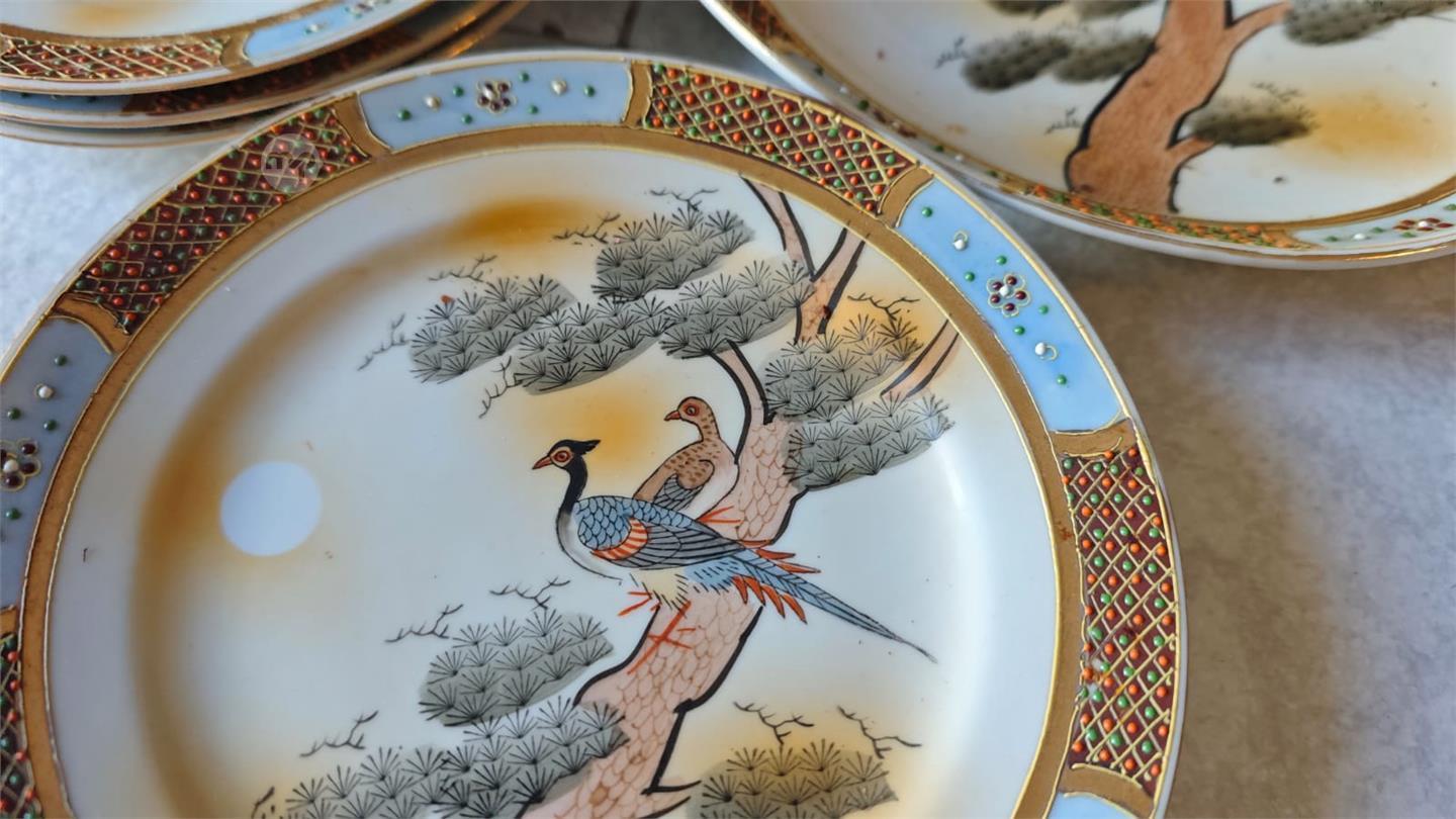 Set of 7 Antique Japanese Plates hand painted with vivid details depicting pheasants on a Tree branch. 6 plates have an approx diameter of 18.5 cm and the larger serving plate diameter of 24.5 cm.