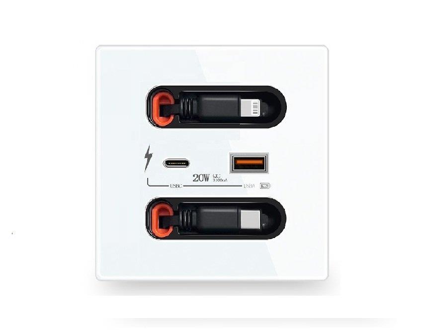 White In-Wall Charging Switch | USB A, USB C & Retractable Cables | Tempered Glass Panel, 20W Fast Charging
