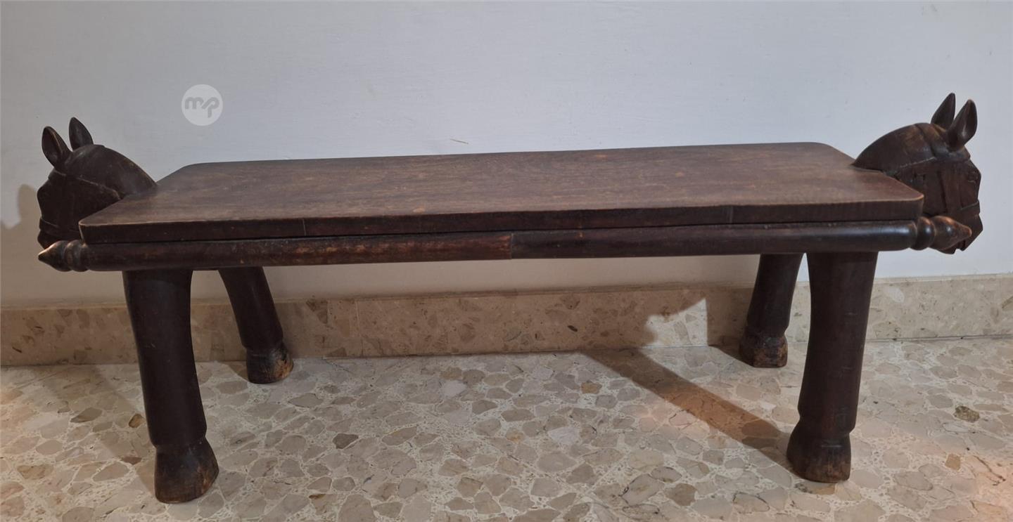 A low beautiful sturdy wooden bench with horse's head at both ends. Would look lovely with plants on top too.