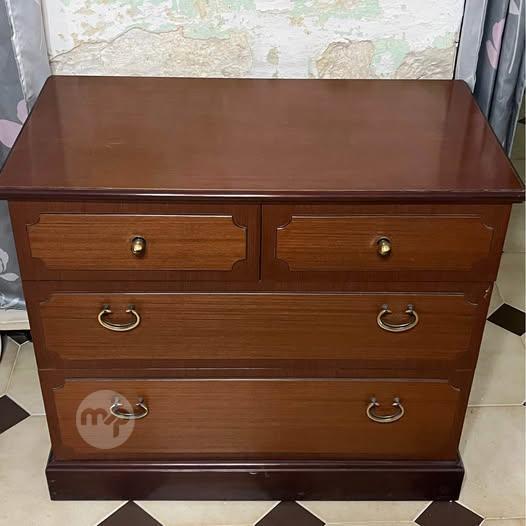 Bed, 2 x drawers, 2 x wardrobes, headrest with 2 night tables, chest, dressing table with mirrors.