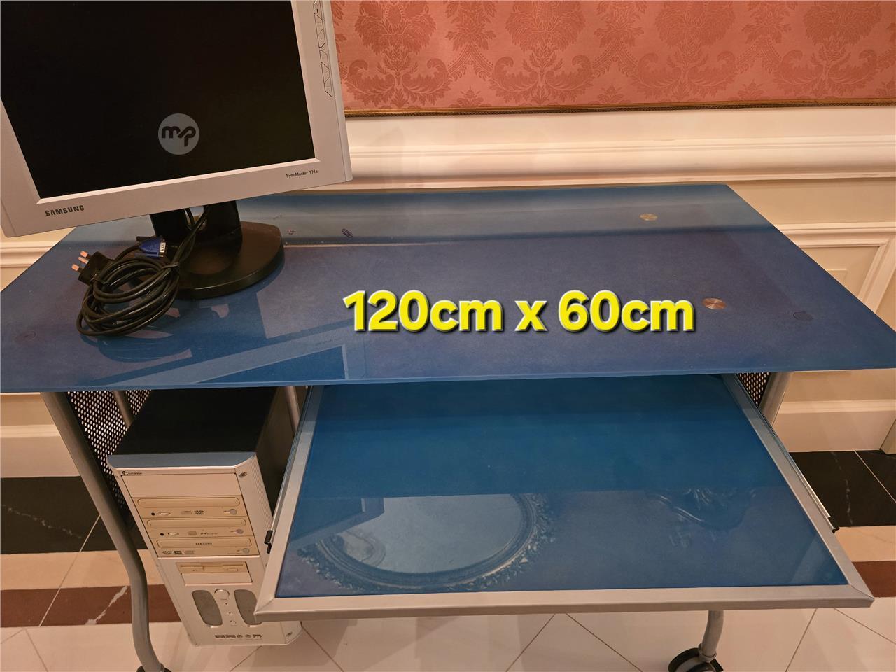 Office Desk with beautiful, blue glass top. Heavy duty with very comfortable extendible keyboard drawer. Condition like new, no scratches or dents. Castors with functional brakes. Colour Samsung Monitor 17" with VGA connection. When bought, this was a high-end product with rotation option from portrait to landscape. Ideal for CCTV cameras viewing.