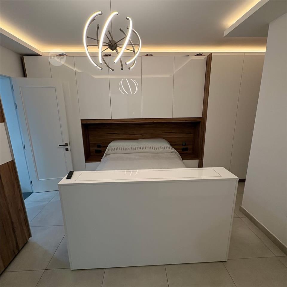 Master bedroom with ensuite shower, ample storage, and a TV lift built into the bed
