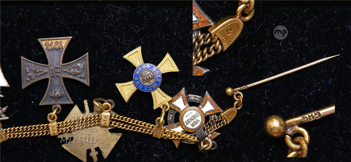 WW1 imperial medal chain in gold, cased, by Gebr. Godet, Berlin. Great condition. Button with maker mark of Godet. Hard to find in this condition with these type of miniatures medals. No repairs, no damage.WW1 imperial medal chain in gold The pin is marked 585 This composition is commonly referred to as 14-karat gold, cased, by Gebr. Godet, Berlin. Great condition. Button with maker mark of Godet. Hard to find in this condition with these type of miniatures medals. No repairs, no damage..